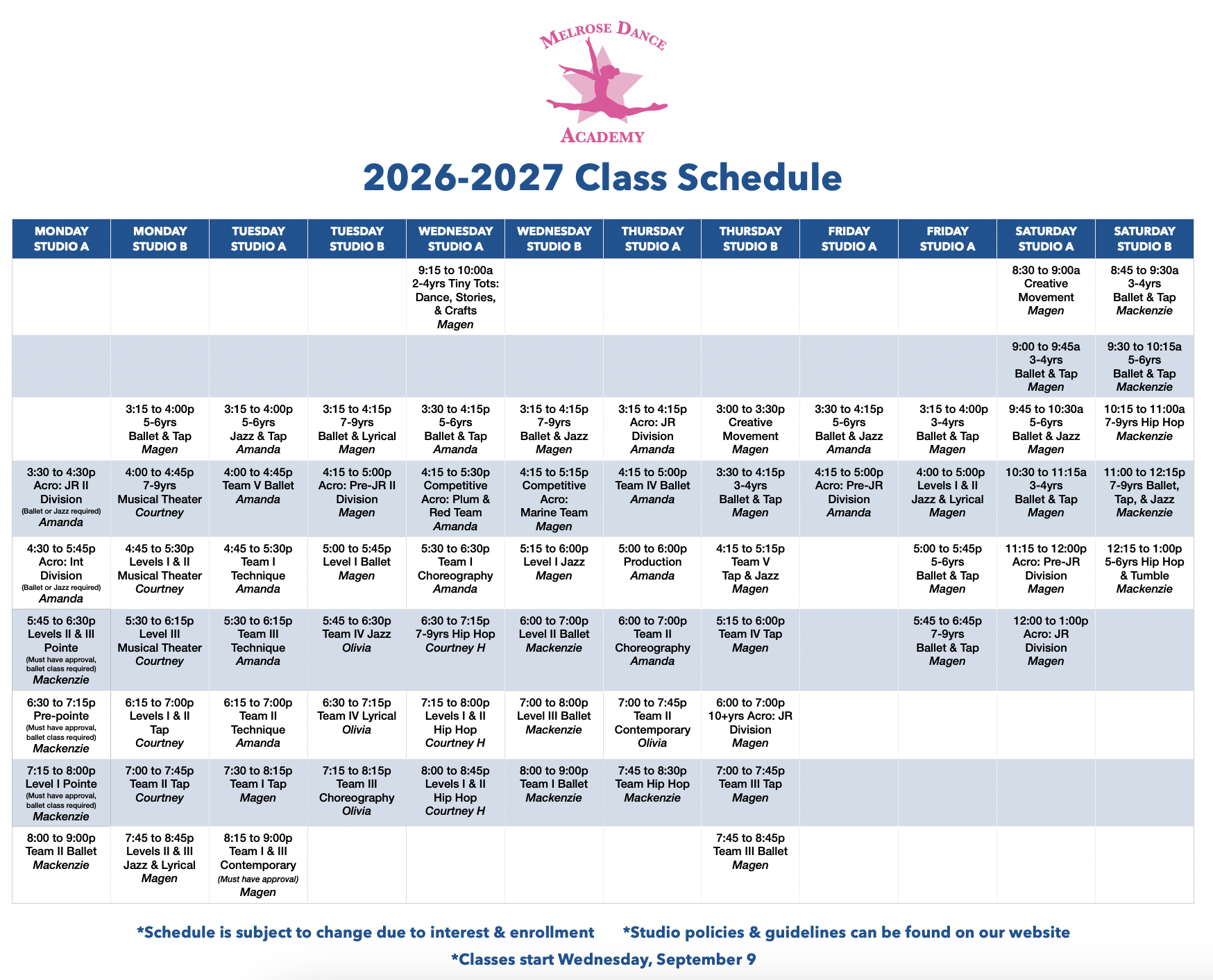 Melrose Dance Academy offers a wide variety of classes, including Ballet, Tap, Jazz, Lyrical, Contemporary, Hip Hop, Musical Theater, Acro & more for all ages, and levels. We are happy to help your dancer out with class selections.